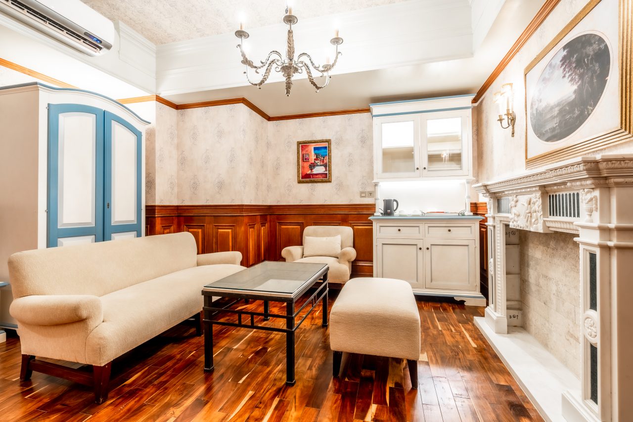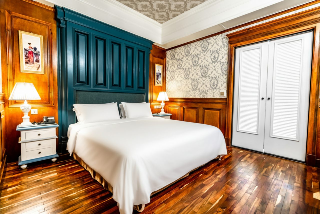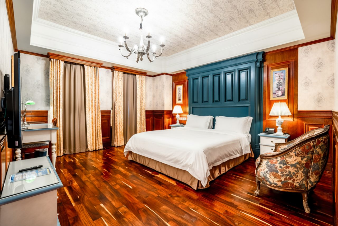 在深藍木作與精緻壁紙交織出的典雅空間中,盡享尊貴舒眠體驗。 精緻貴妃椅搭配溫潤木質地板,為旅人營造浪漫休憩時光。