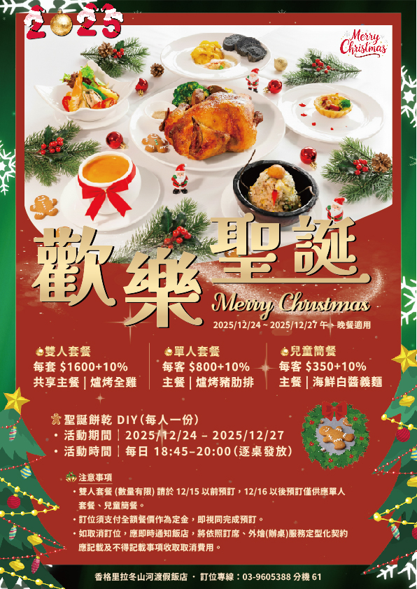 ● 雙人套餐(含烤雞)須於 2025/12/15 前預訂。12/16 以後預訂,僅供應前述單人套餐、兒童簡餐。