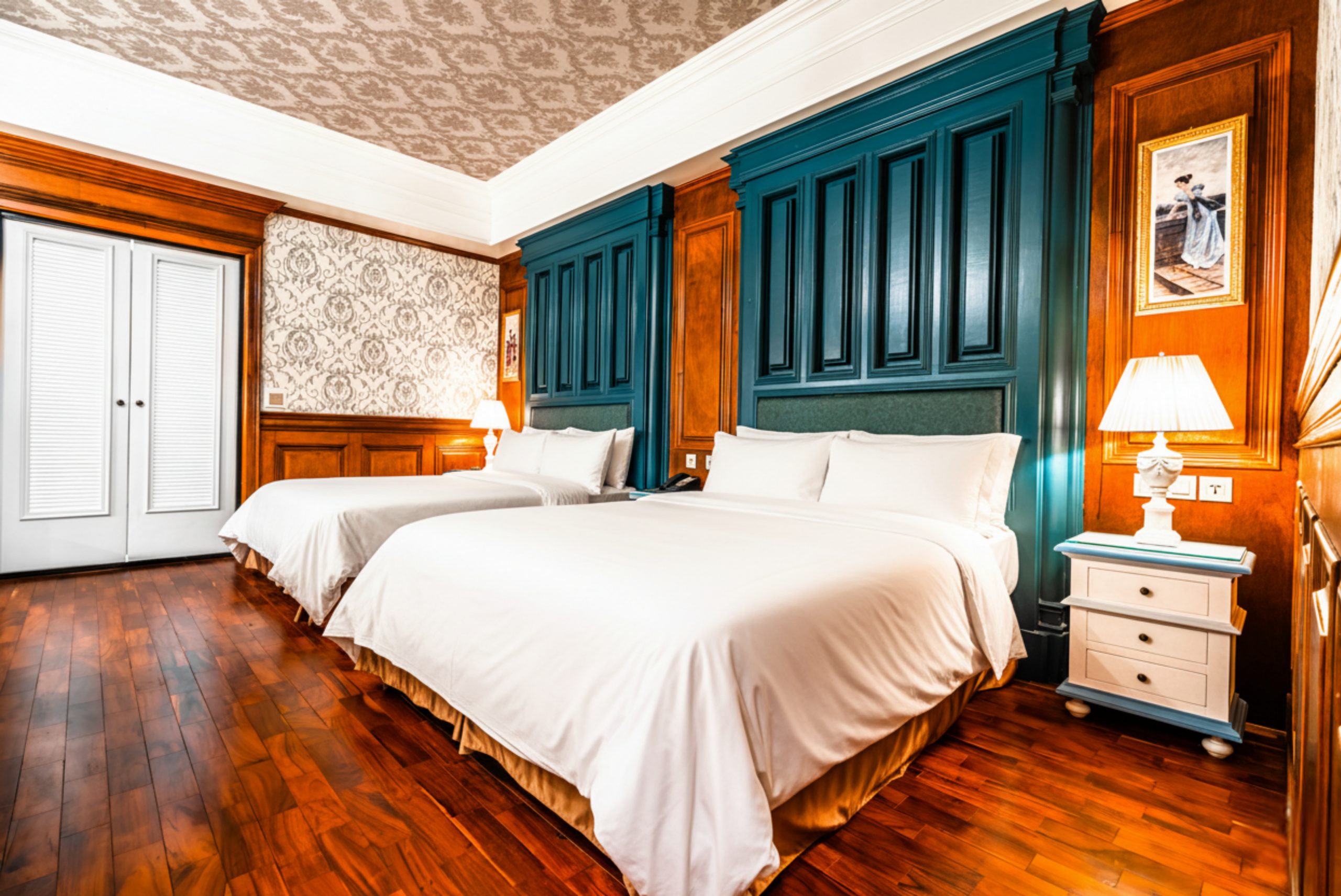 在深藍木作與精緻壁紙交織出的典雅空間中,盡享尊貴舒眠體驗。 精緻貴妃椅搭配溫潤木質地板,為旅人營造浪漫休憩時光。