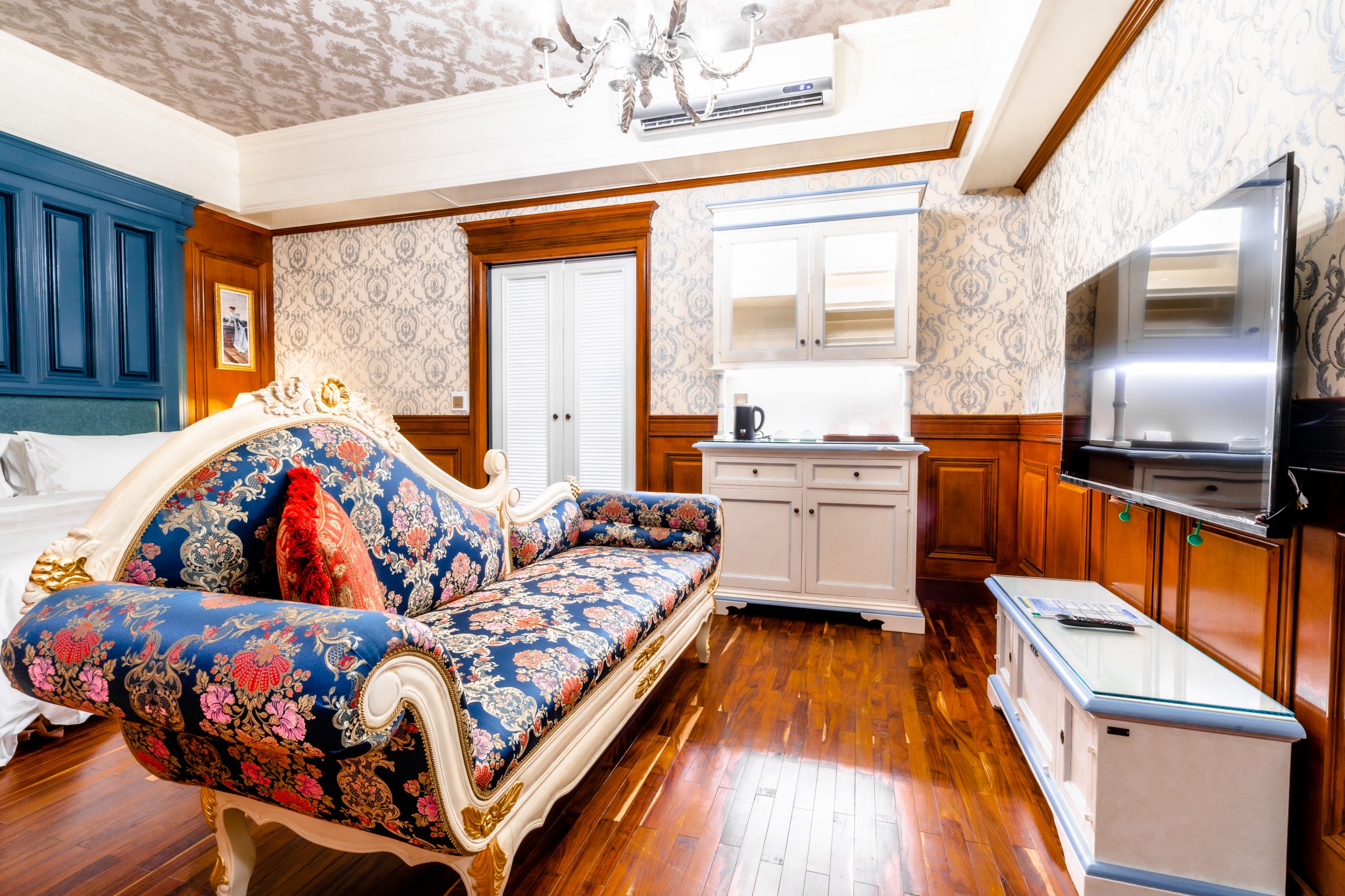 在深藍木作與精緻壁紙交織出的典雅空間中,盡享尊貴舒眠體驗。 精緻貴妃椅搭配溫潤木質地板,為旅人營造浪漫休憩時光。