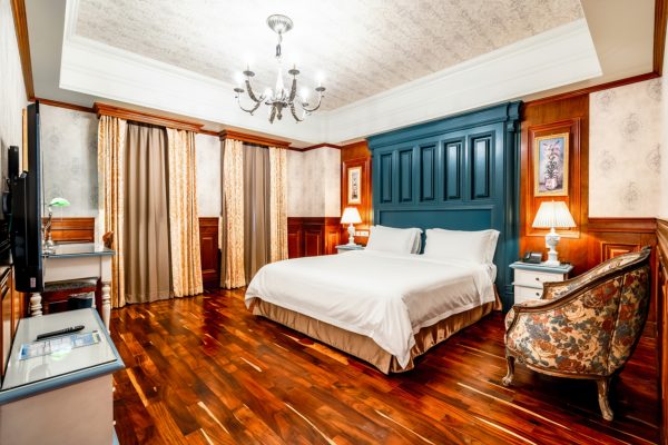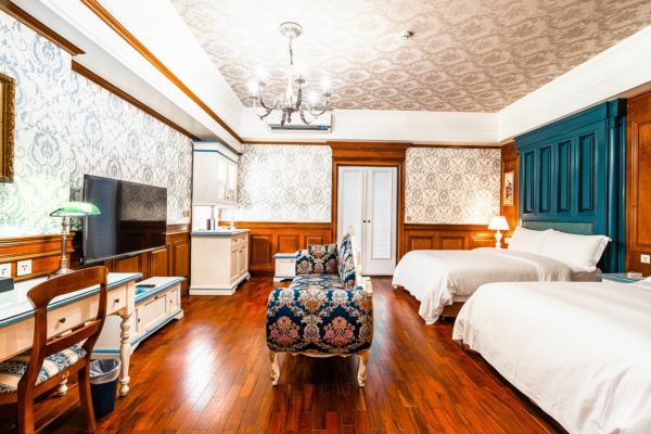 在深藍木作與精緻壁紙交織出的典雅空間中,盡享尊貴舒眠體驗。 精緻貴妃椅搭配溫潤木質地板,為旅人營造浪漫休憩時光。